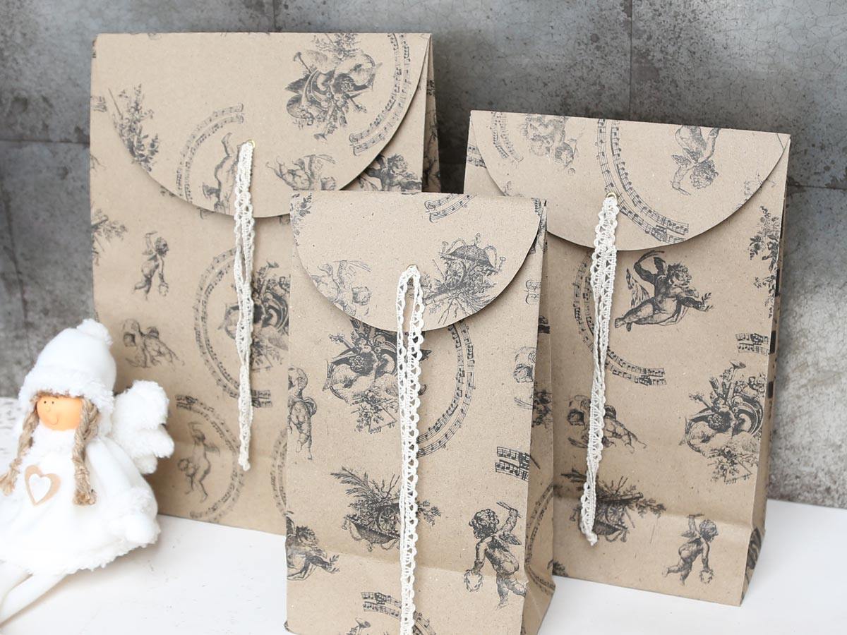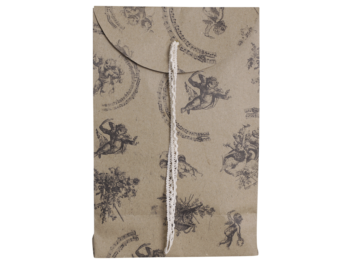 Vianočná dekoračná papierová taška v prírodnej farbe s potlačou anjelov.