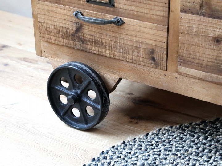 Potravinárska drevená komoda s 20 zásuvkami nakolieskach