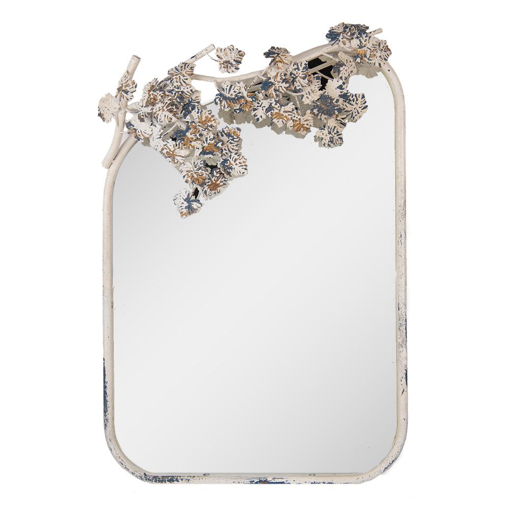 Dekoratívne nástenné zrkadlo v bielej farbe s kovovým rámom zdobeným ozdobnými listami v štýle brocante.