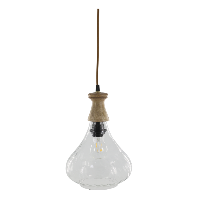 Elegantné závesné svietidlo, ktoré kombinuje číre sklo s mosadznou hornou časťou,