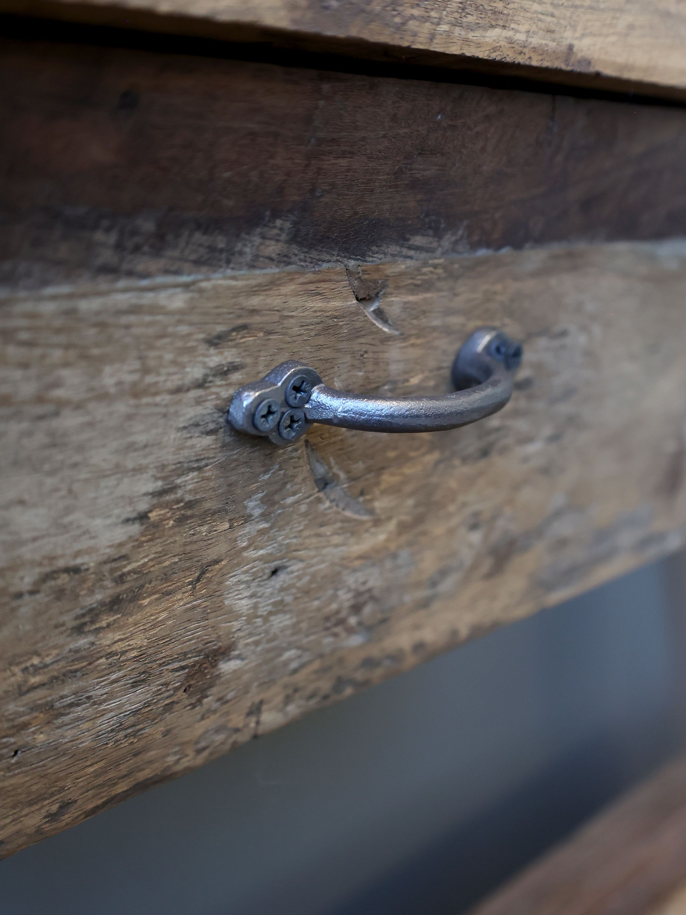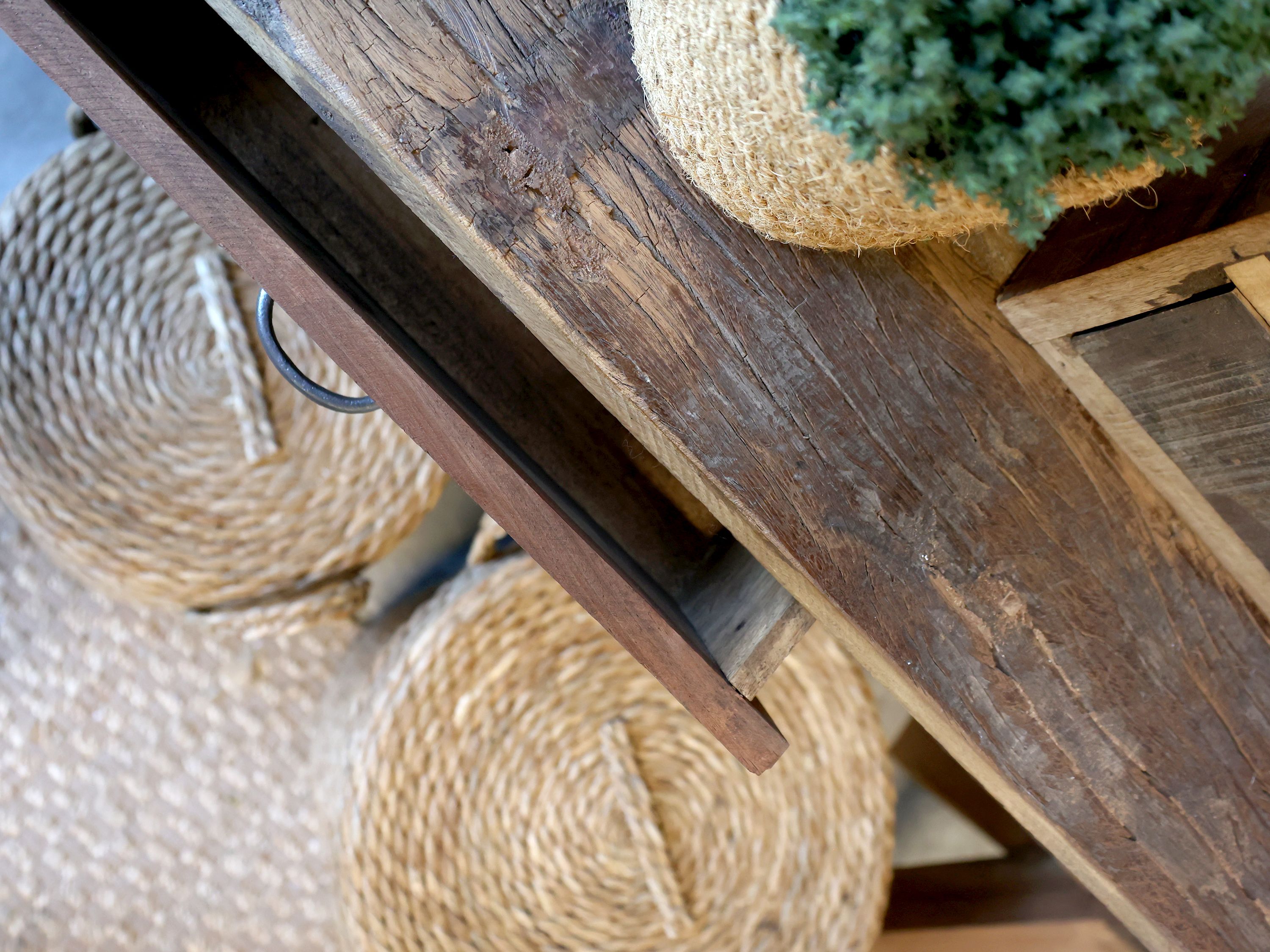 Tento elegantný stôl s jedným praktickým šuflíkom je vyrobený výhradne z recyklovaného dreva,