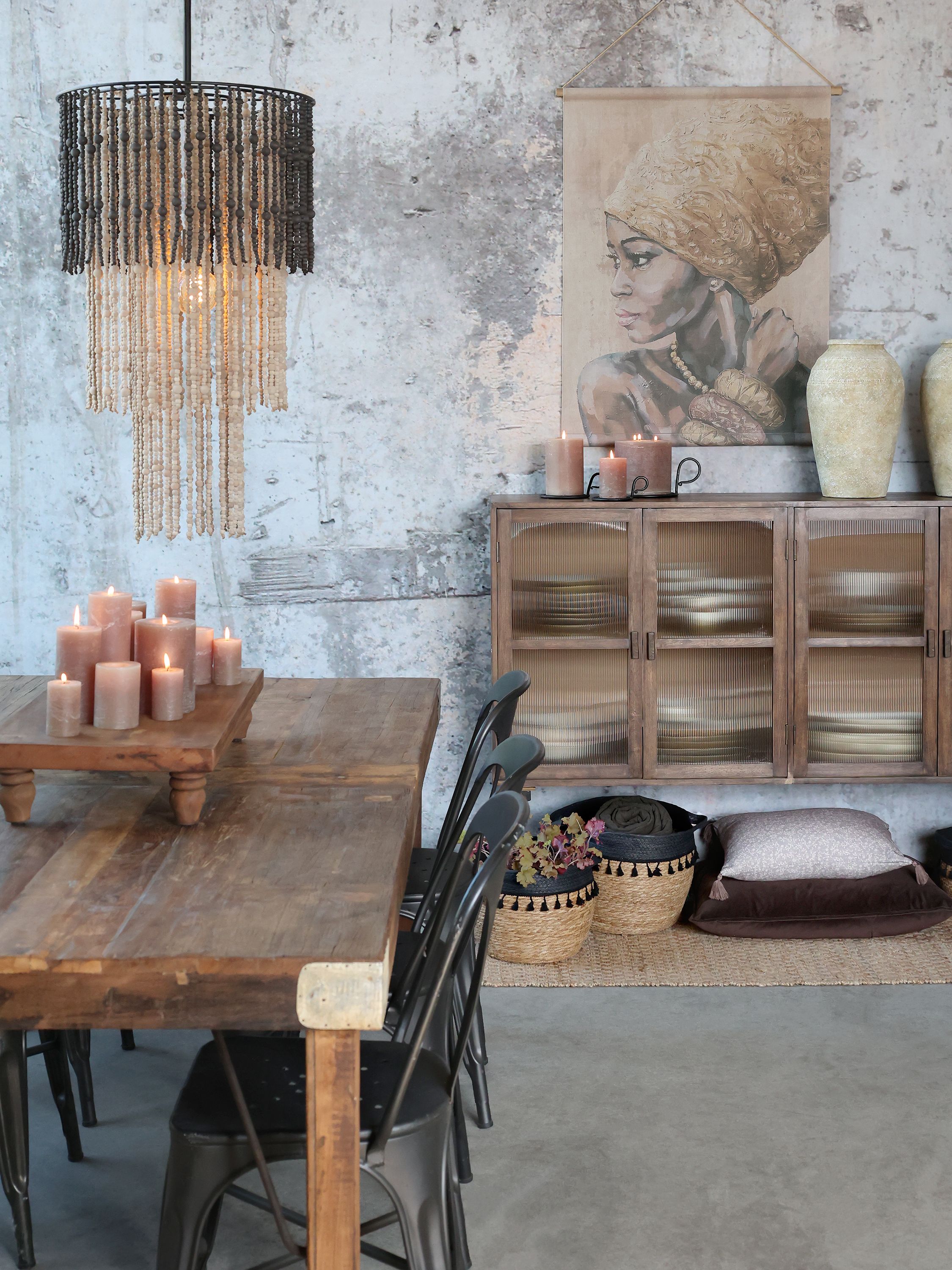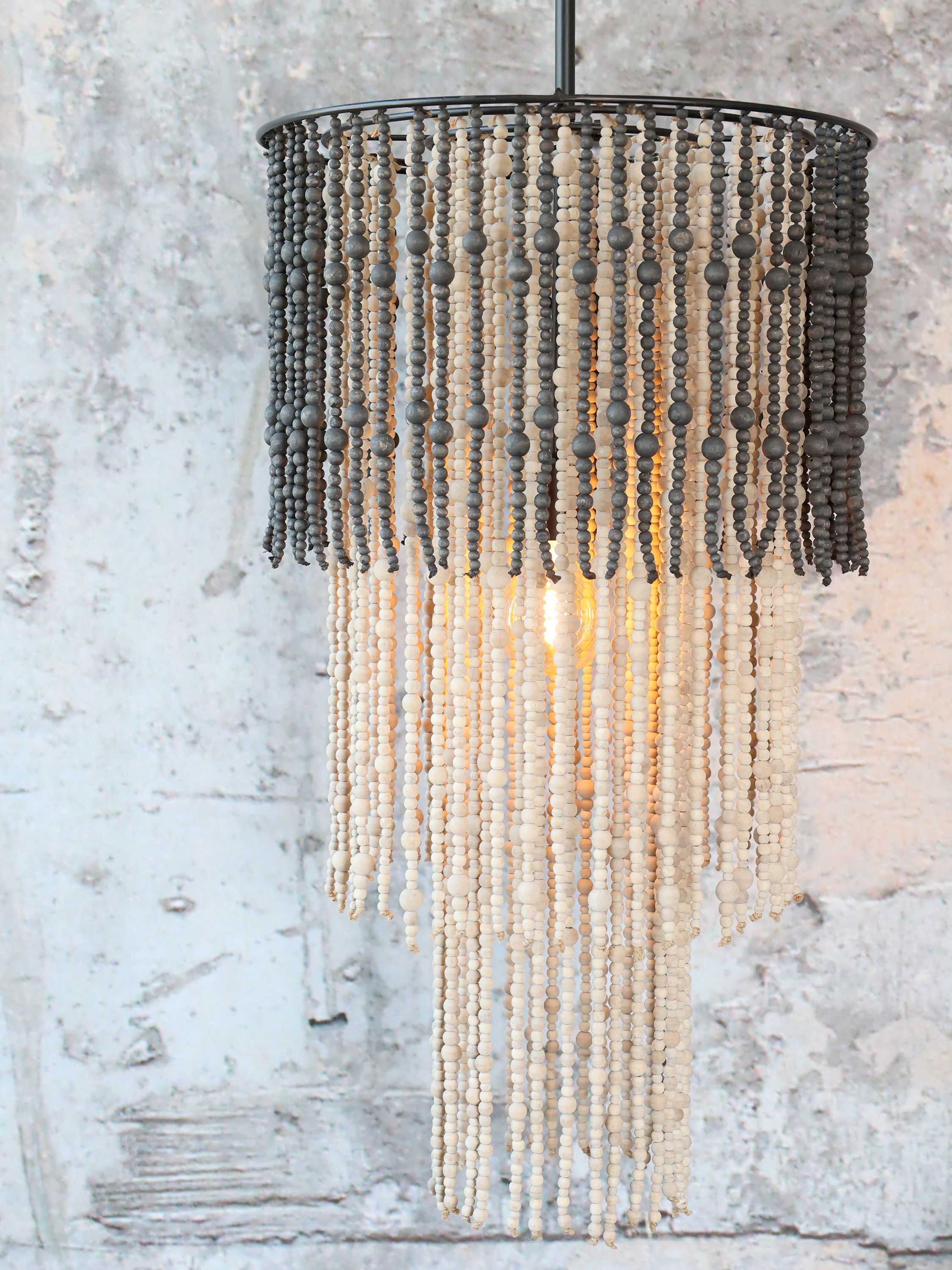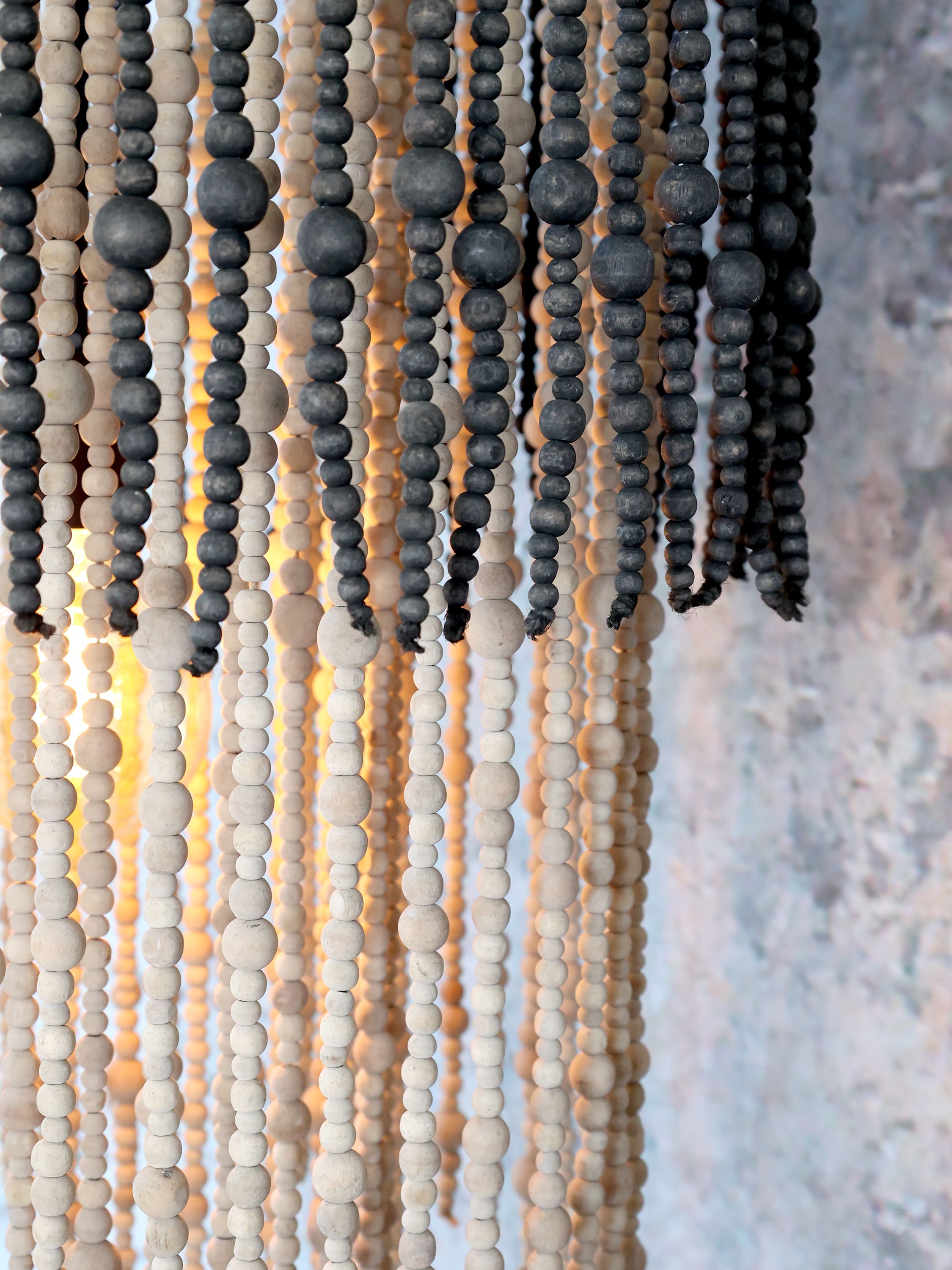 Tento závesný luster, zdobený množstvom drevených korálok,