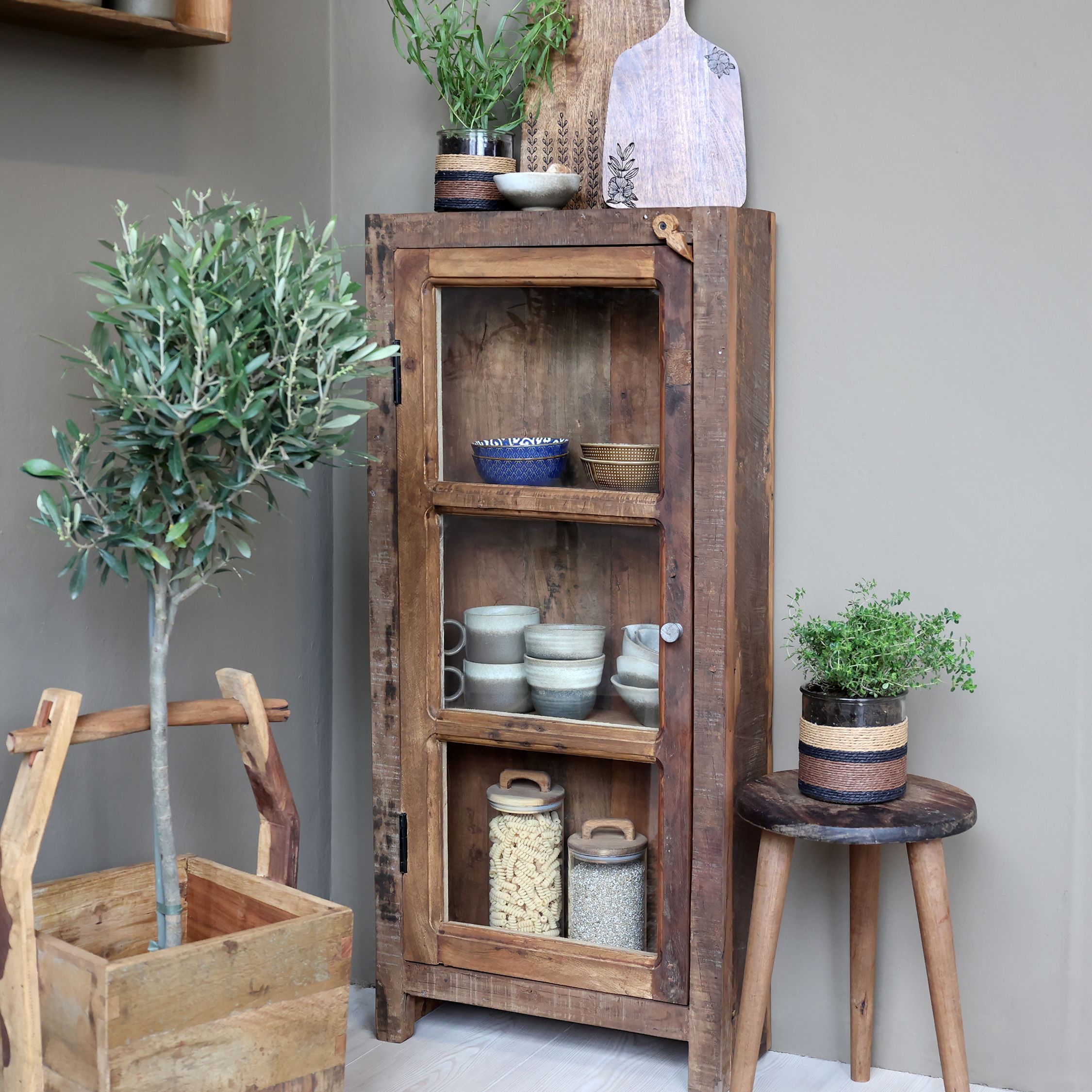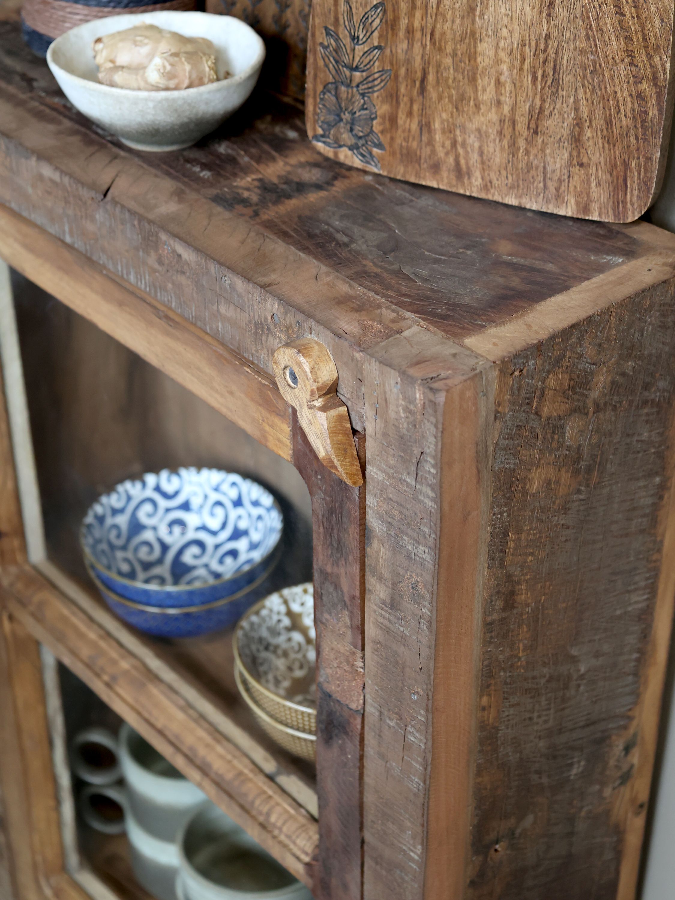 Vitrína je vyrobená z recyklovaného dreva, ktoré jej dodáva jedinečný,