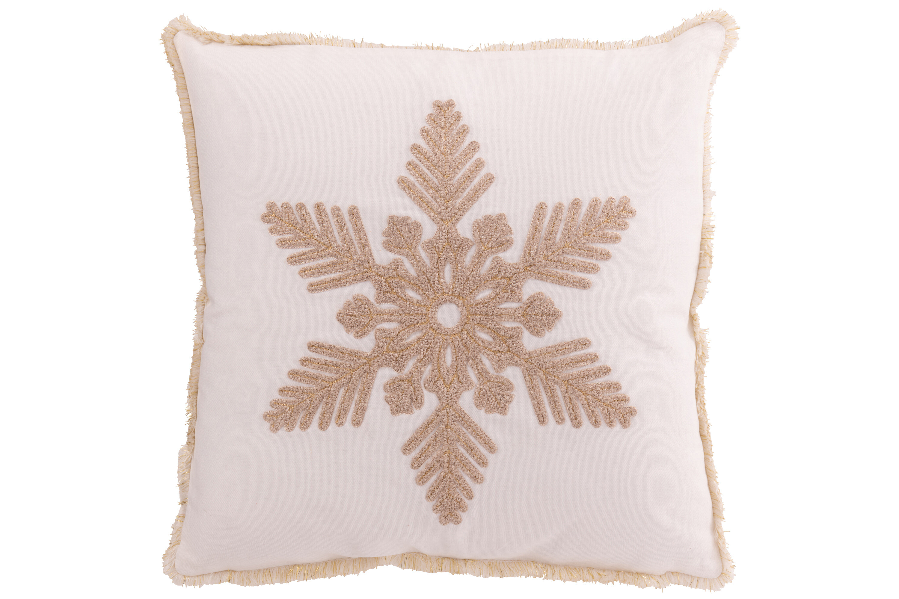 Elegantný vankúš so vzorom snehovej vločky v jemných odtieňoch bielej a béžovej je dokonalým doplnkom pre váš zimný či vianočný interiér.