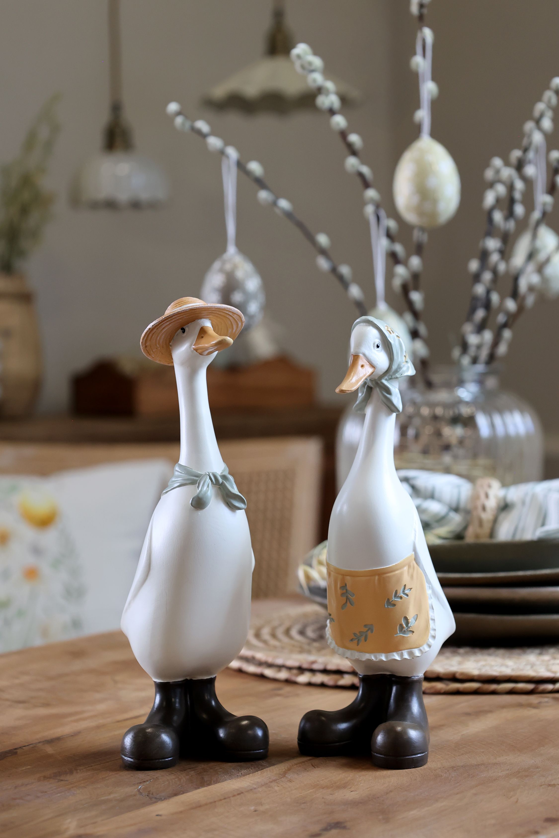 Ich milý výraz a jemné detaily vyniknú na poličke, komode, parapete či v sezónnej dekorácii na stole. Sada dvoch husí vytvára harmonický celok a perfektne zapadne do interiérov v vintage, vidieckom alebo shabby chic štýle.