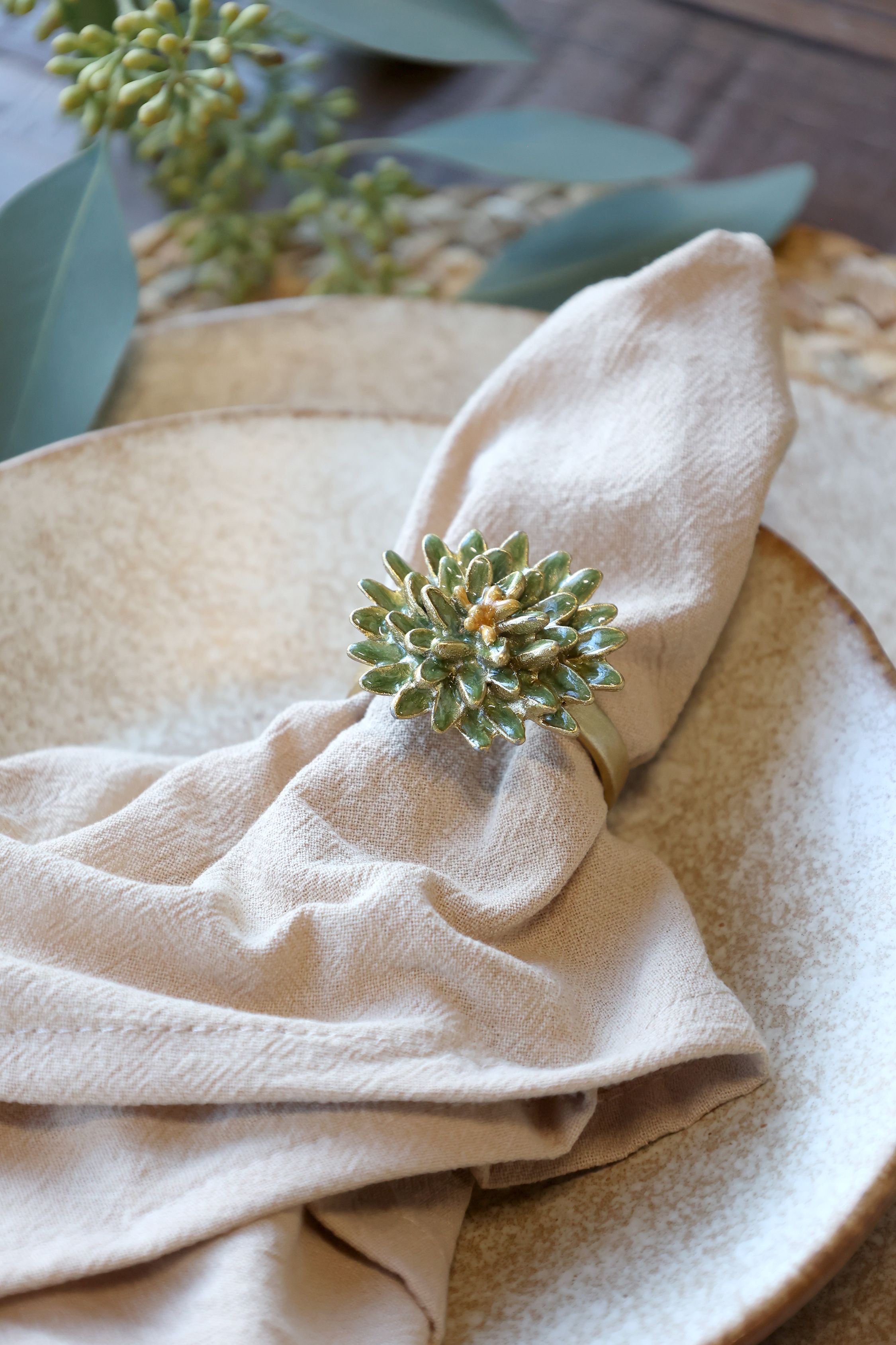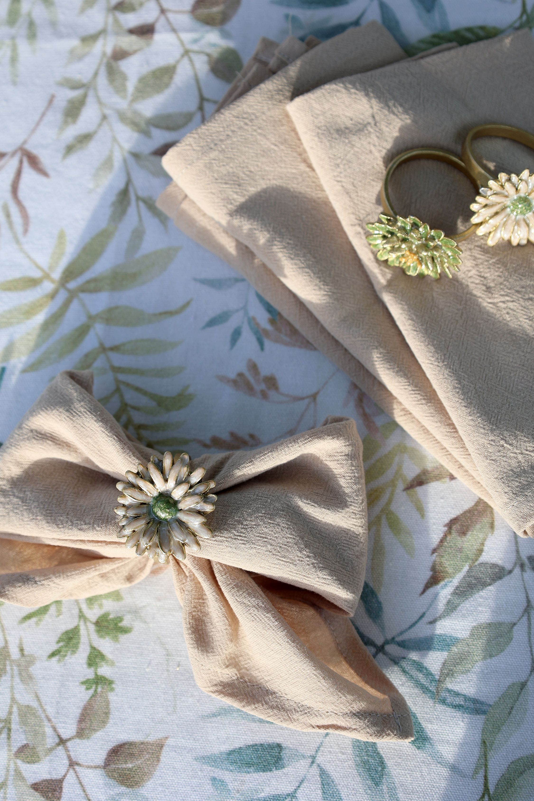 Elegantný servítkový prsteň s kvetinovým motívom v jemnom zelenkavom