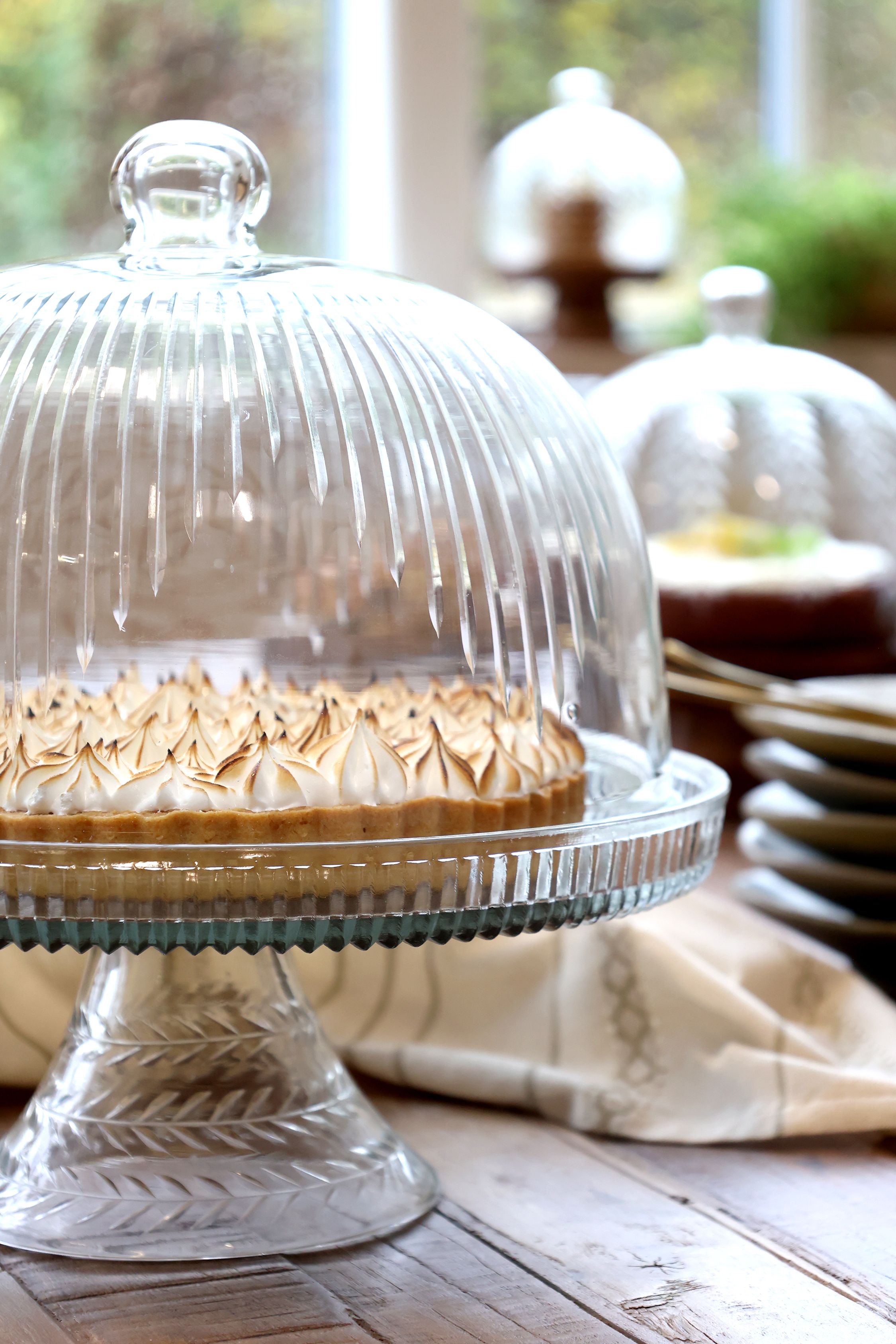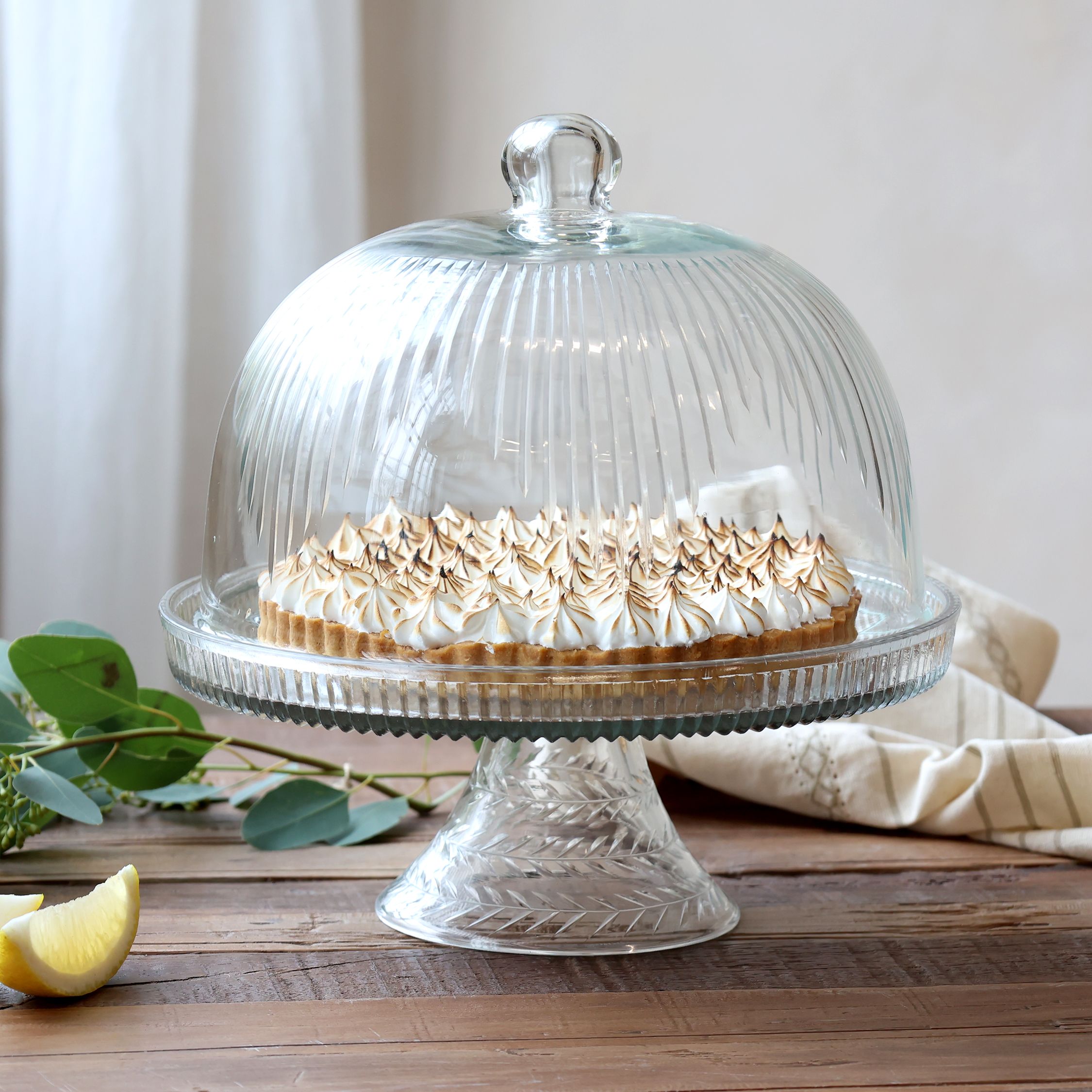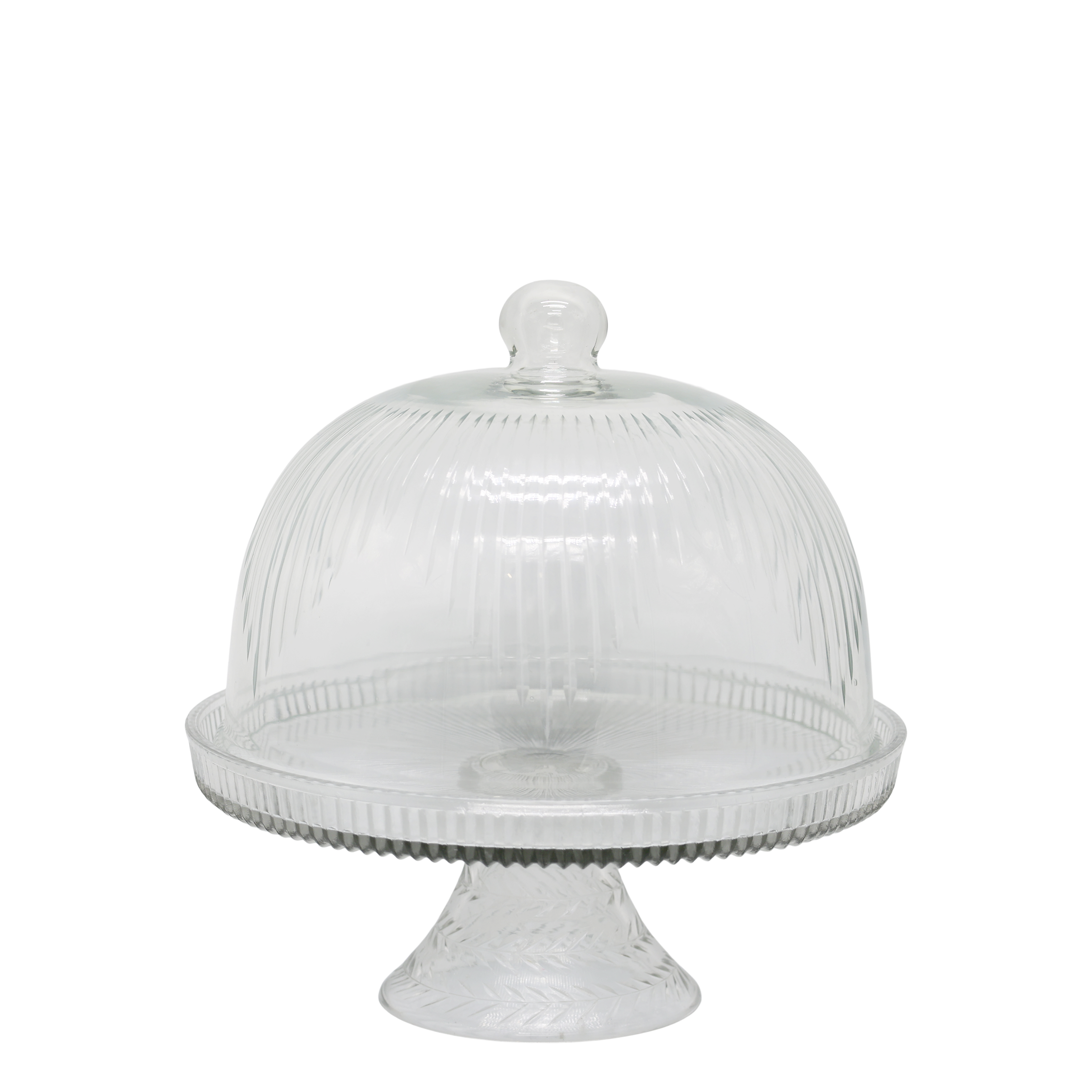 Dodajte svojim dezertom pódiu, ktoré si zaslúžia. Táto majestátna celosklenená kupola na vysokej nohe je stelesnením elegancie. Číre sklo s jemným brúseným vzorom vytvára nádherné odlesky svetla,
