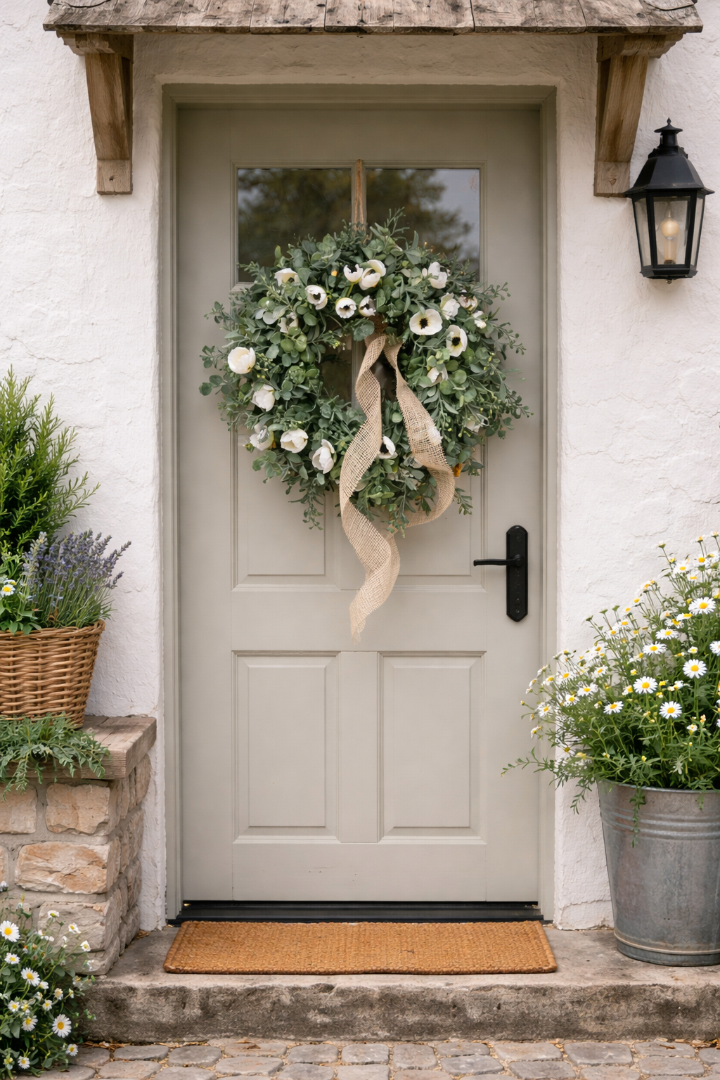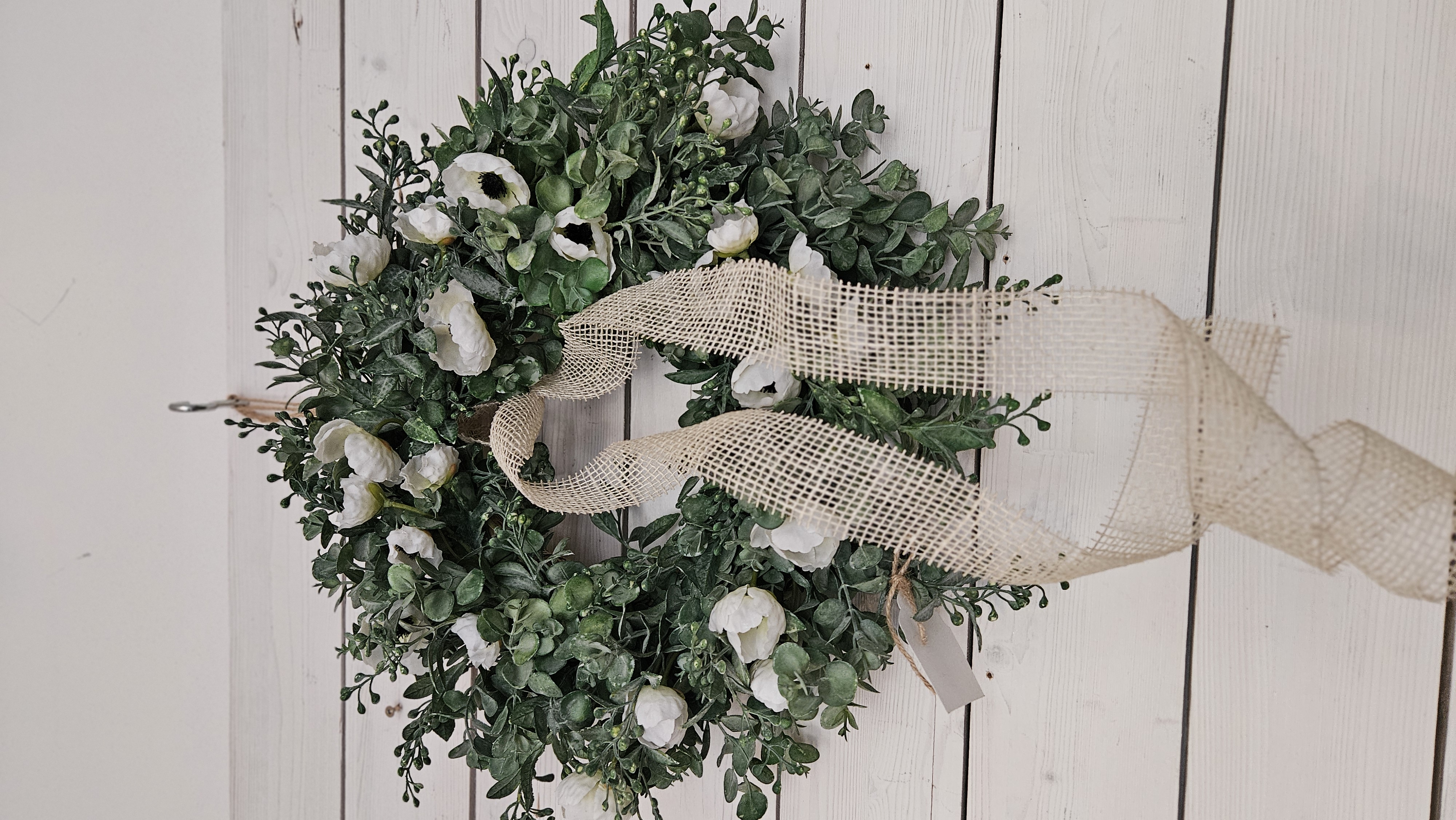 Nadčasový dizajn: Jemná kombinácia bielych kvetov a zelených listov s bobuľkami . Pôsobí elegantne a upokojujúco. Skvele sa hodí na vchodové dvere, nad krb alebo ako centrálna dekorácia na stenu.