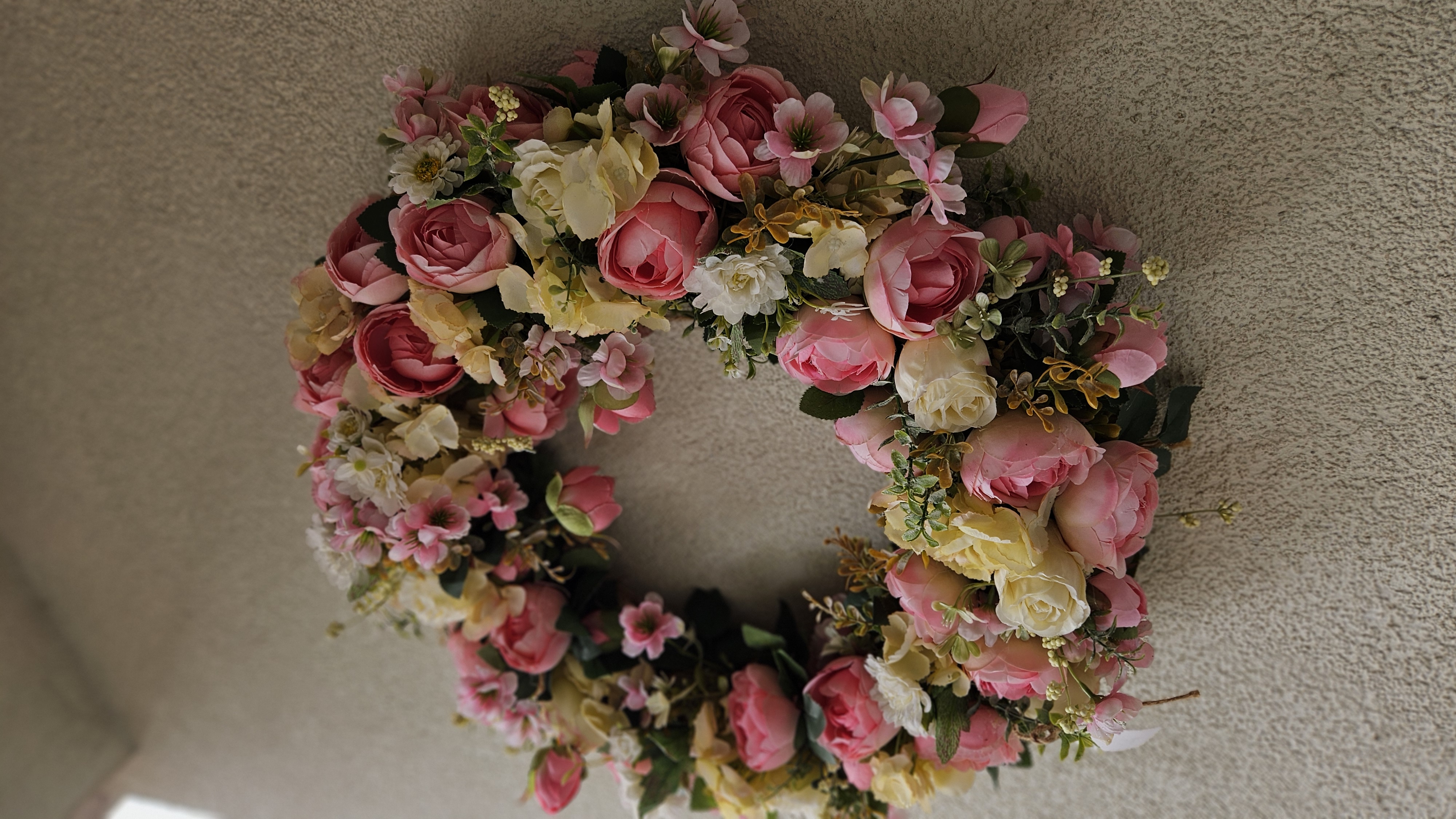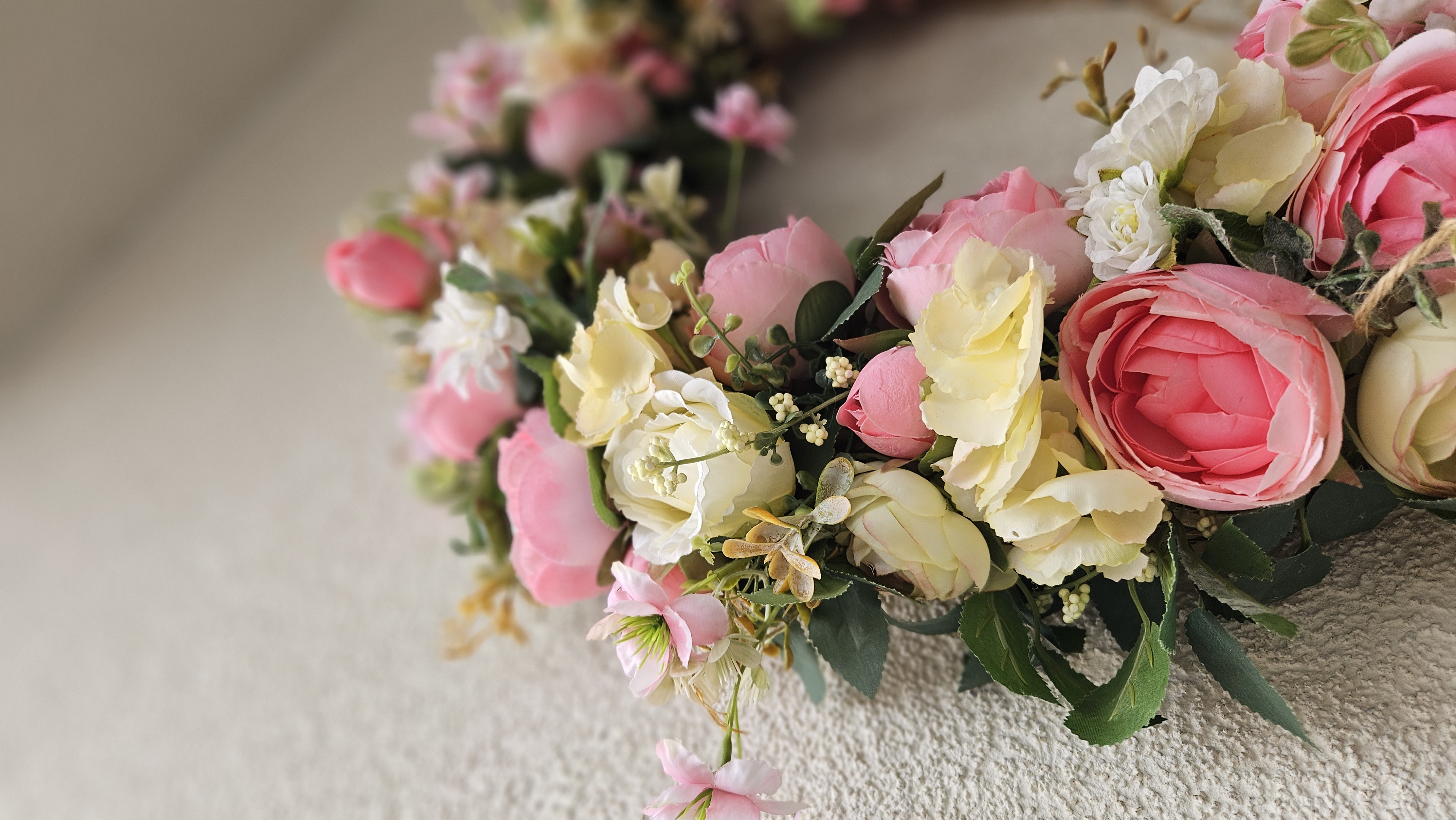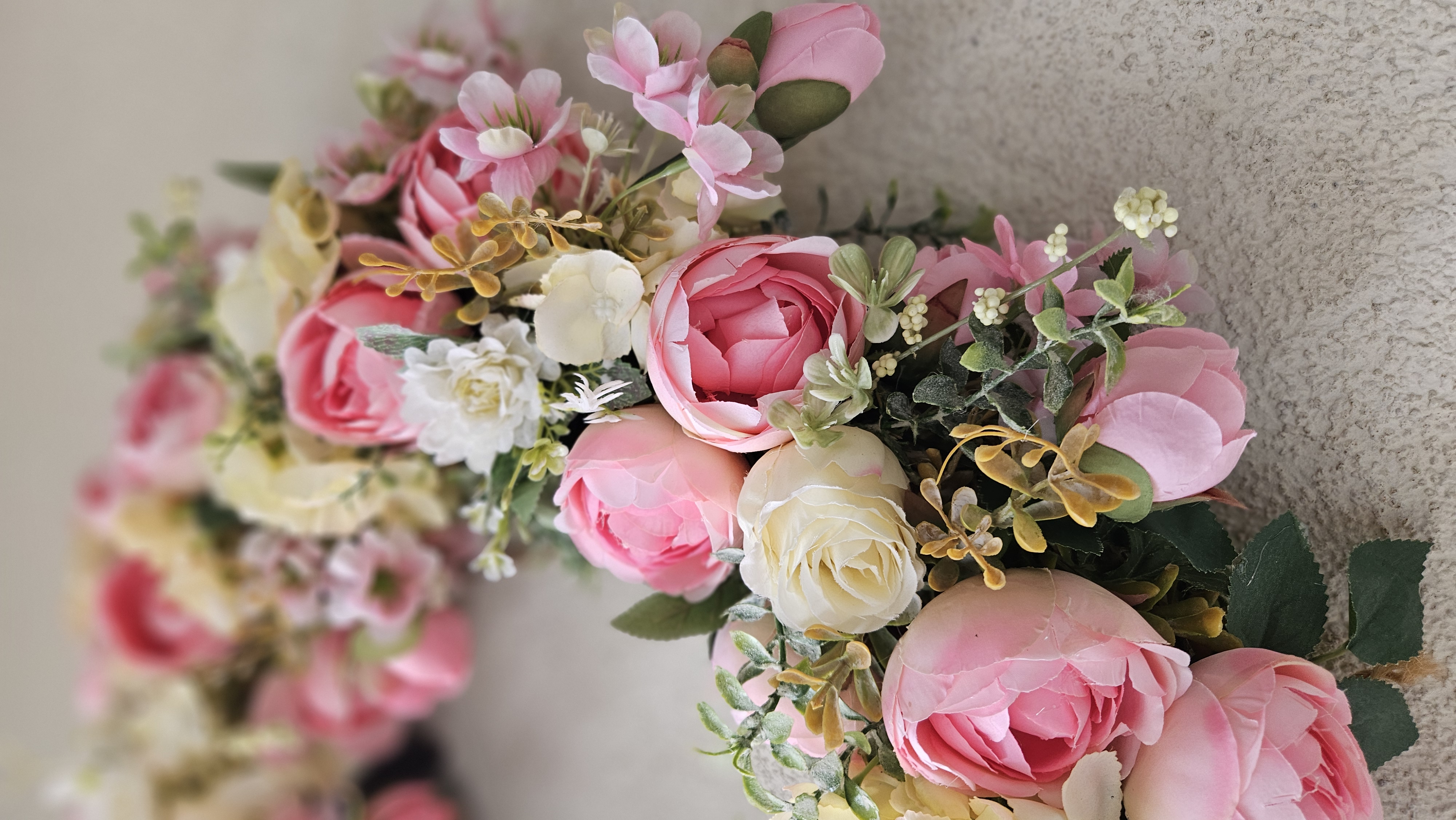 Plnosť a objem: Veniec je „plnokvetý“, čo znamená, že sme nešetrili materiálom, aby pôsobil bohato a luxusne z každého uhla.